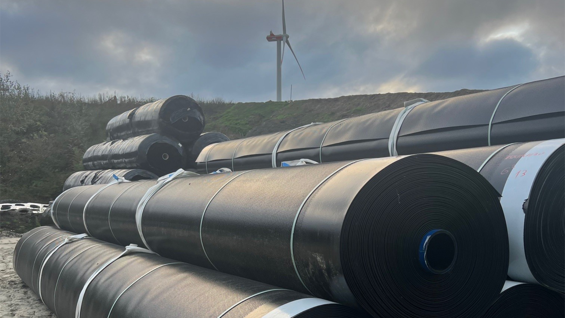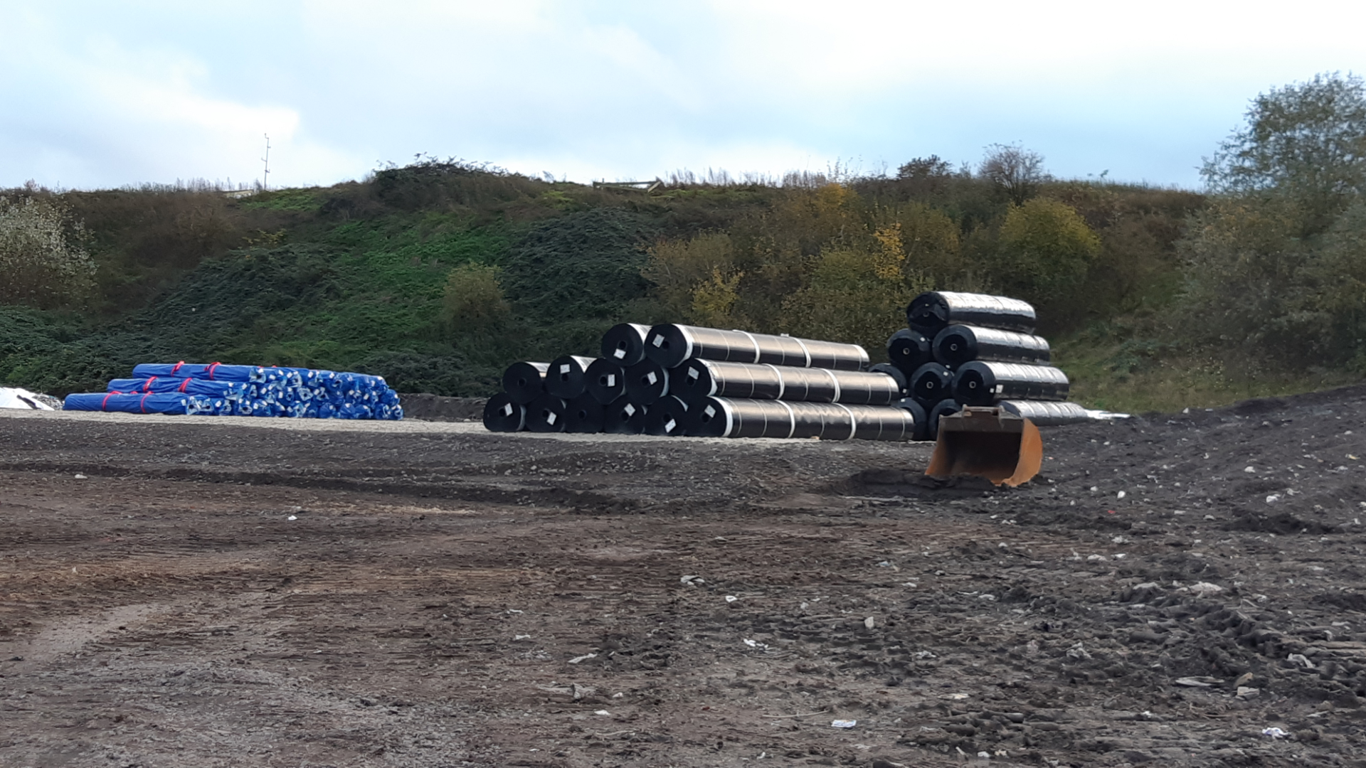Vorbereitend zum Bau der Oberflächenabdichtung und des vorab zu erstellenden Probefeldes wurden die Materialien für die technische Dichtungskomponente angeliefert. Die Kunststoffdichtungsbahnen, die Bentonitmatten und die Drainagematten befinden sich auf einer temporären Zwischenlagerfläche auf dem derzeit aktiv genutzten Schüttabschnitt bis zum Einbau in die Oberflächenabdichtung.